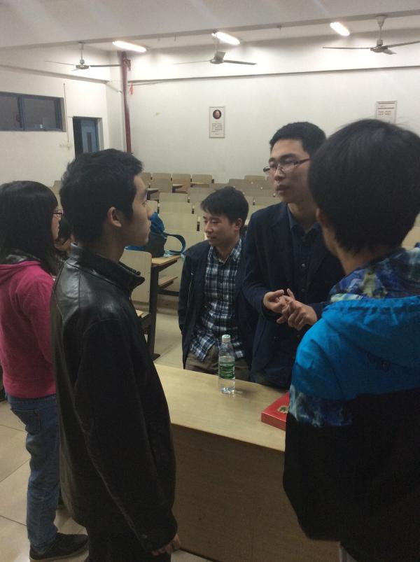 首先,邱中华老师一段简单开场白之后向大家详细介绍了数学建模的相关基本内容及要求,包括数模的基本概念、发展历程及竞赛形式和内容。此外,他还借助具体的题目就建模流程、题意和方向的理解及其他细节性的注意事项进行细致阐述。在交流过程中,他也对数模参与者提出一定的要求:“参与者需有一定的知识储备,要注意节奏、提高效率、突出亮点、端正态度,一定的写作技巧及经验是必备的。”随后,四位数模竞赛获奖者结合自己的参赛经历依次从不同角度与在场同学进行经验分享、交流。常路讯同学强调了组队、赛程时间安排两个方面,她还提到赛前应如何模拟训练的具体事项;朱派同学着重实用性,向大家推荐部分数模参考书目和常用软件,并详细介绍数模四类常见问题——最优化、评估、预测及设计算法和基本思路,有很强的专业性和指导性;冯翰洋同学指出如何有效、合理安排赛程,而姜松同学则强调了心态的重要性,并就校赛前期准备阶段提出忠告。嘉宾们幽默诙谐的话语使得现场气氛轻松积极,大家不时记录笔记,或踊跃提出自己的问题及看法,或是鼓掌表示赞同。