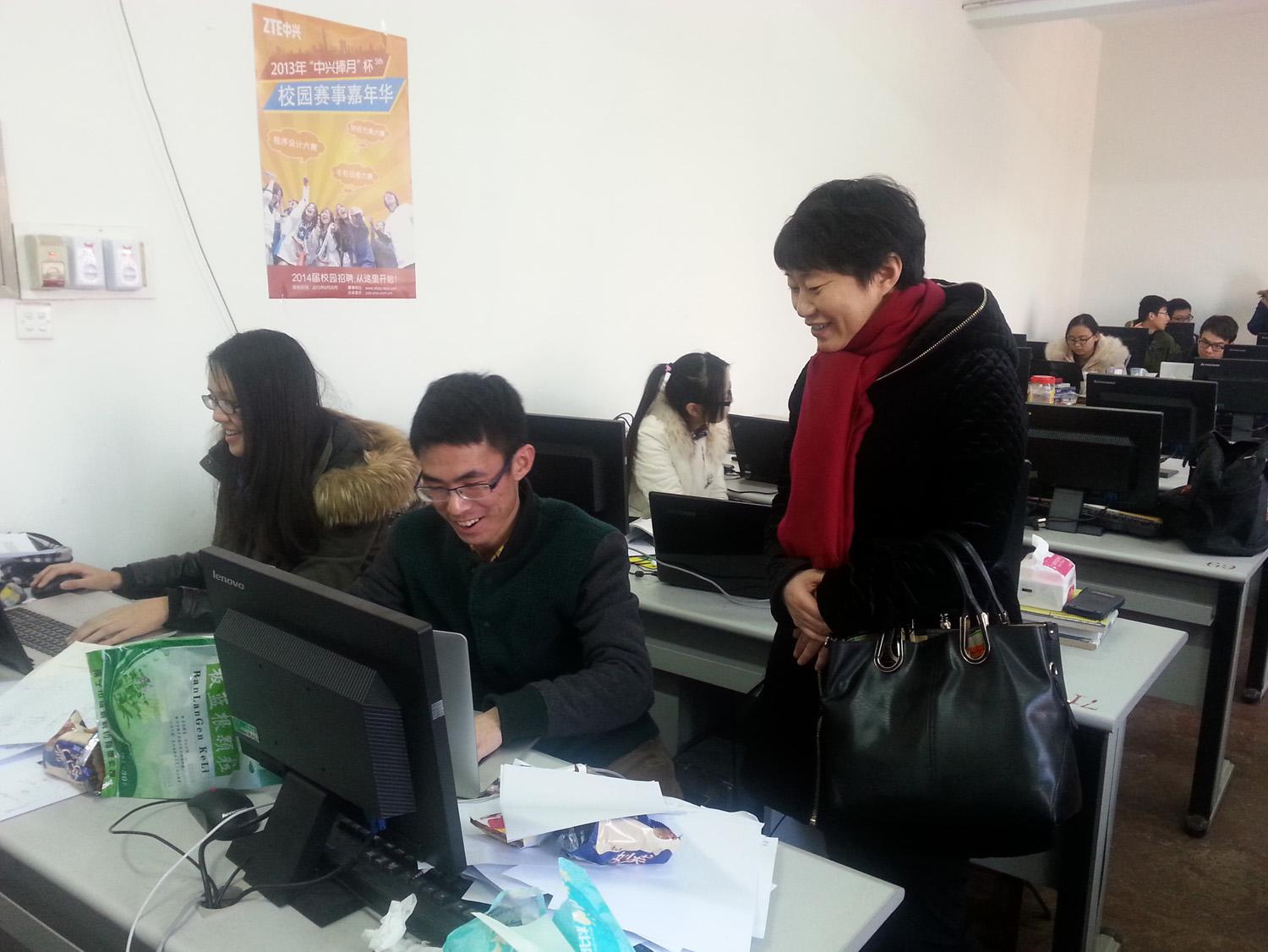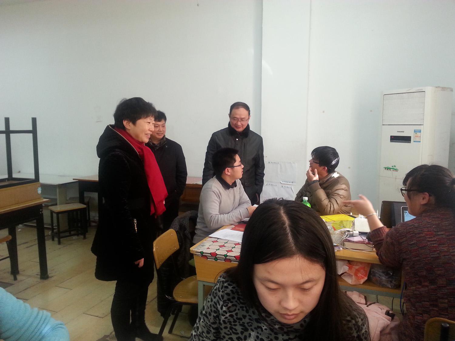 2015年2月8日下午,副校长叶美兰教授、教务处处长王友国教授、副处长陈小惠教授一行,来到三牌楼校区,在理学院副院长唐加山教授以及总教练孔告化副教授等老师的陪同下,亲切看望了参加2015年美国大学生数学建模竞赛的同学们。