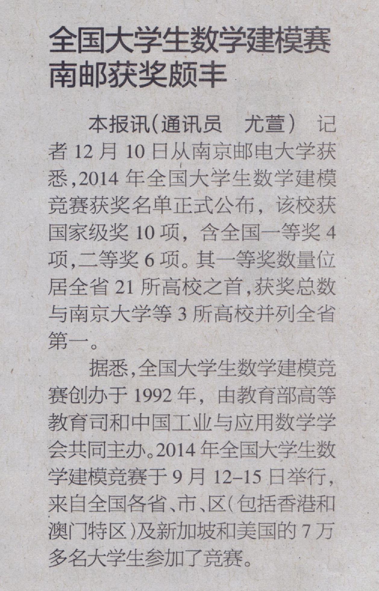 【江苏教育报】全国大学生数学建模赛南邮获奖颇丰