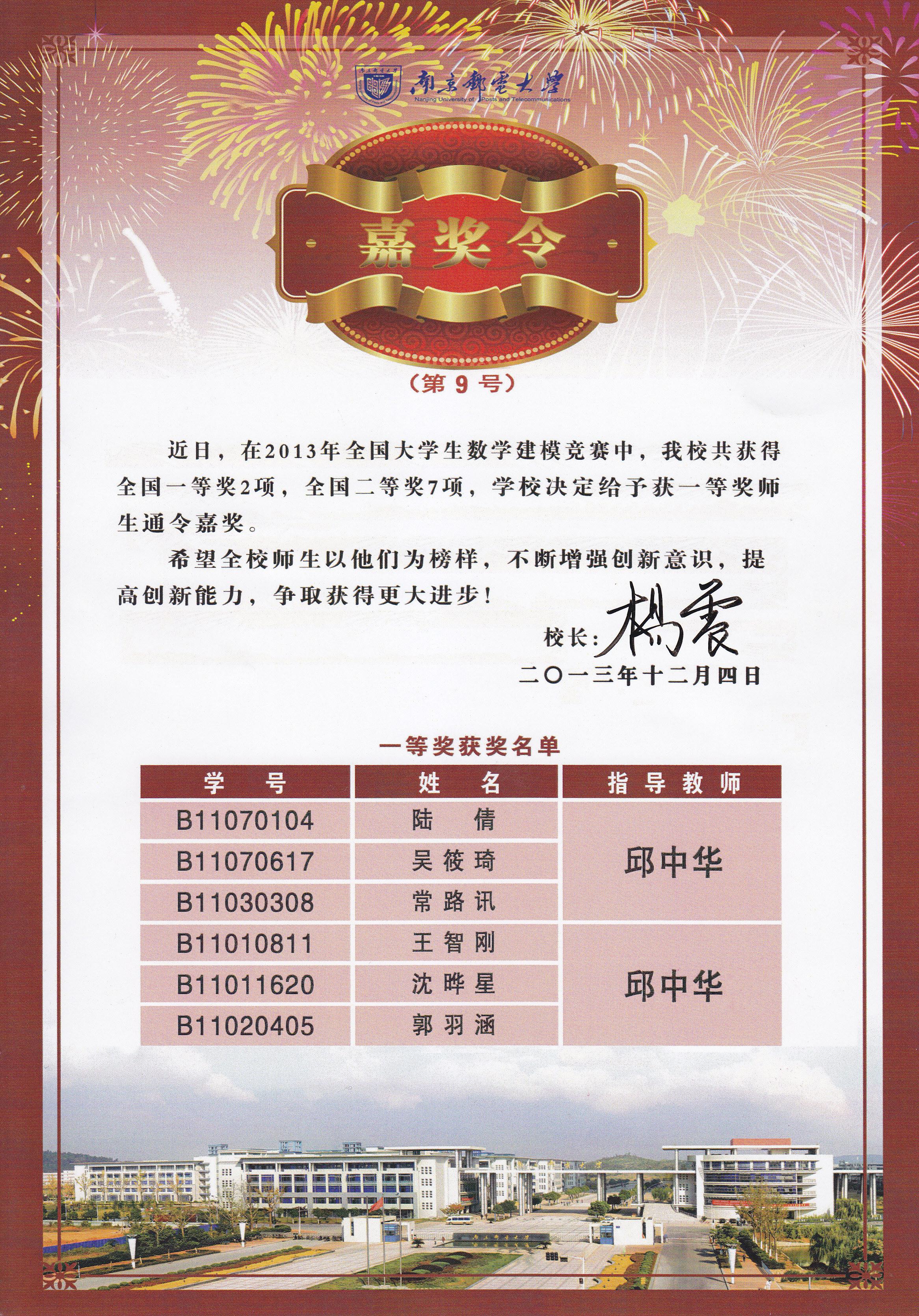 近日,在2013年全国大学生数学建模竞赛中,我校共获得全国一等奖2项,全国二等奖7项。