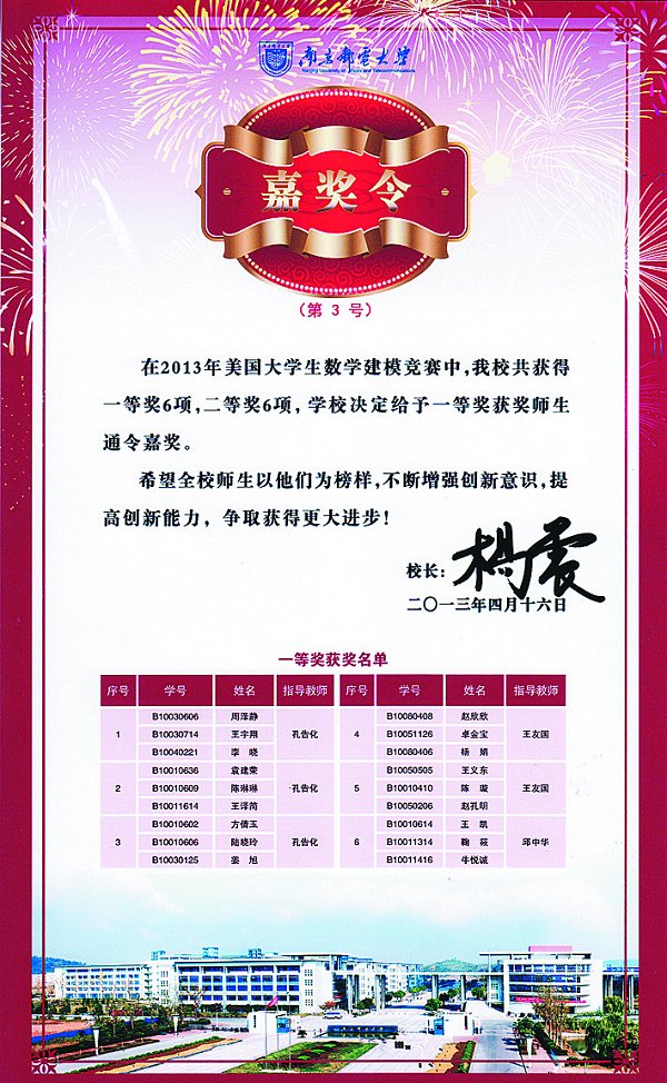 近日,我校学生在2013年美国大学生数学建模竞赛中获得一等奖。学校特发嘉奖令予以表彰,希望全校师生以他们为榜样,不断增强创新意识,提高创新能力,争取获得更大进步。