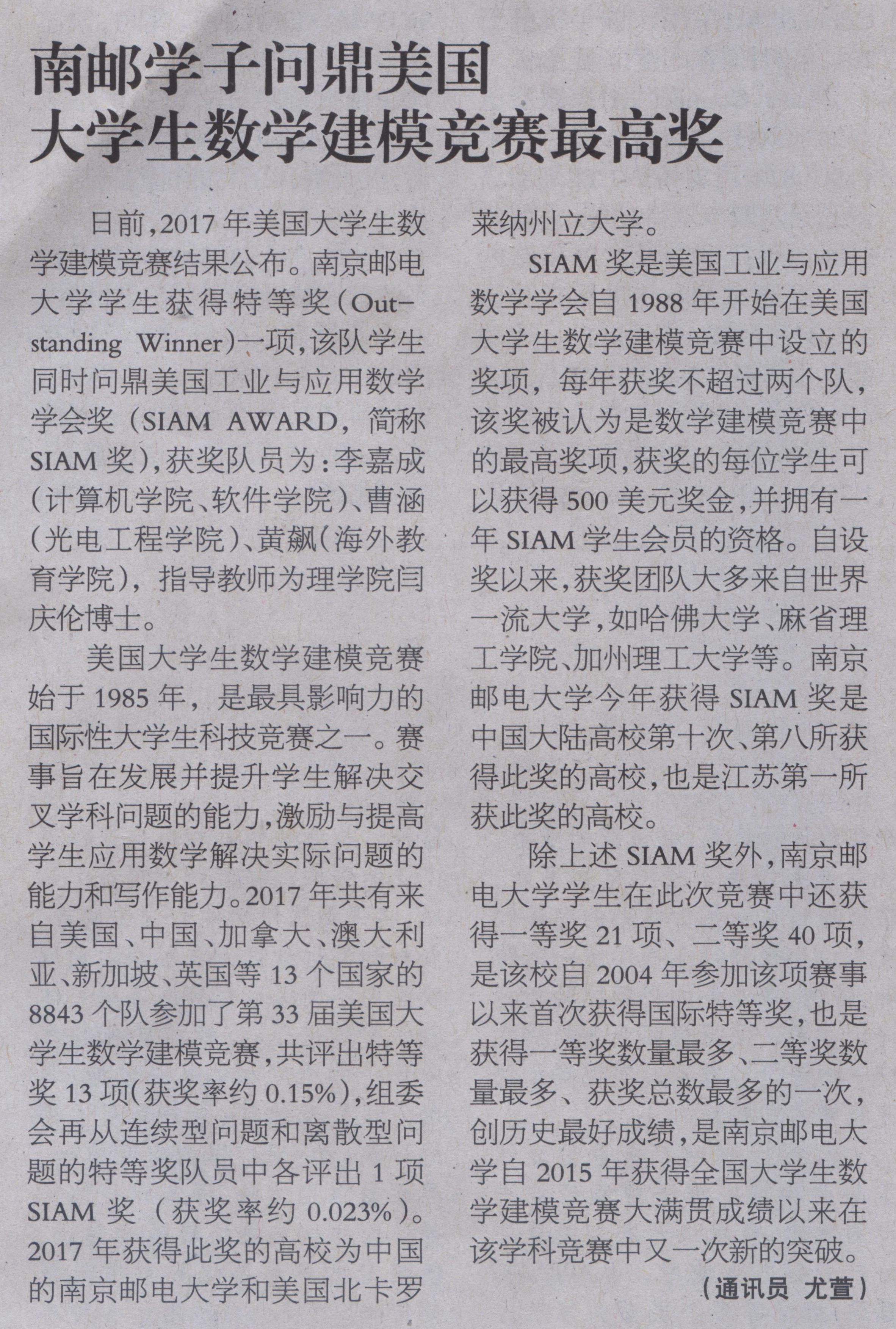 【人民邮电】南邮学子问鼎美国大学生数学建模竞赛最高奖