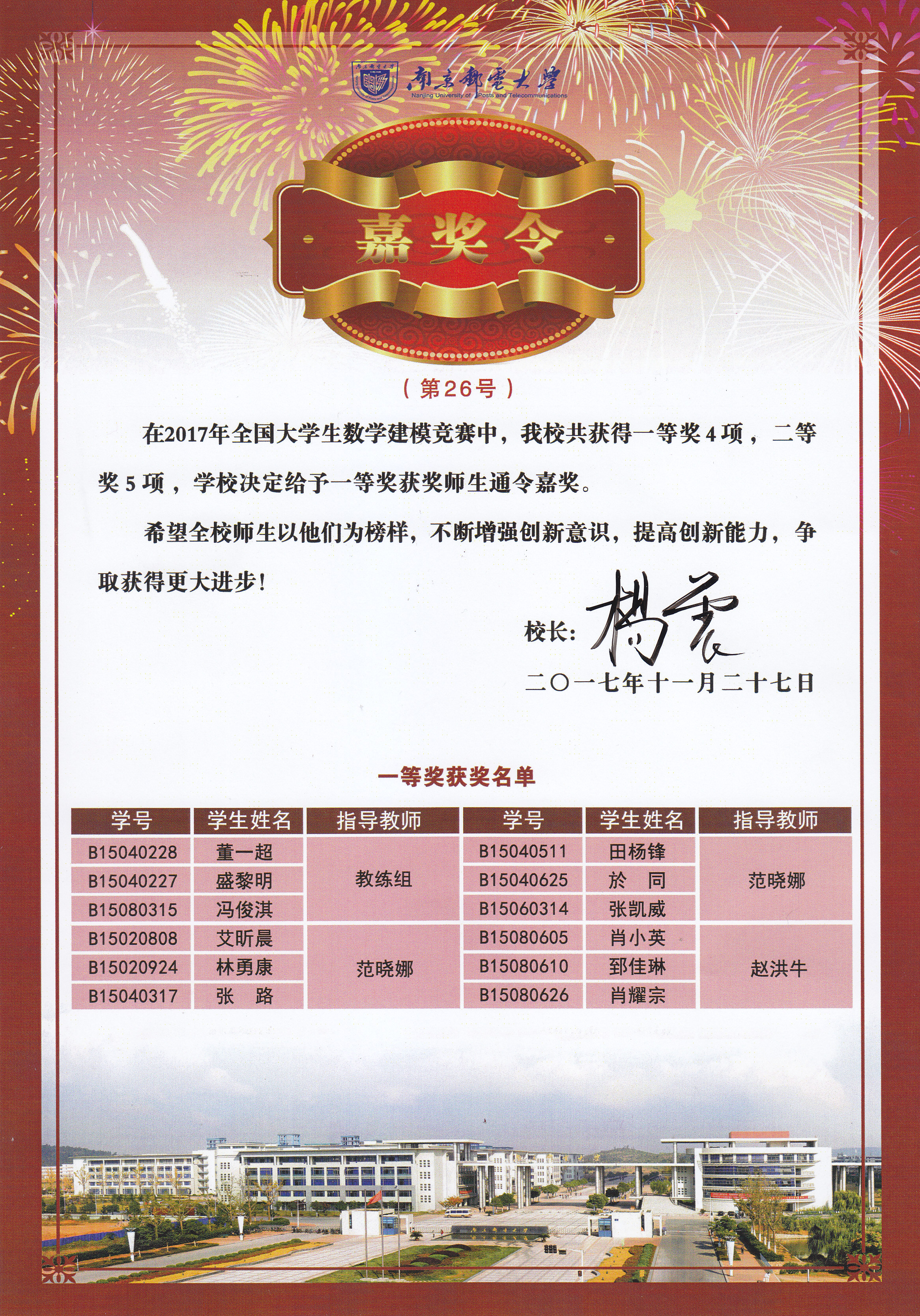 杨震校长签发嘉奖令表彰我校“2017年全国大学生数学建模竞赛“获奖师生