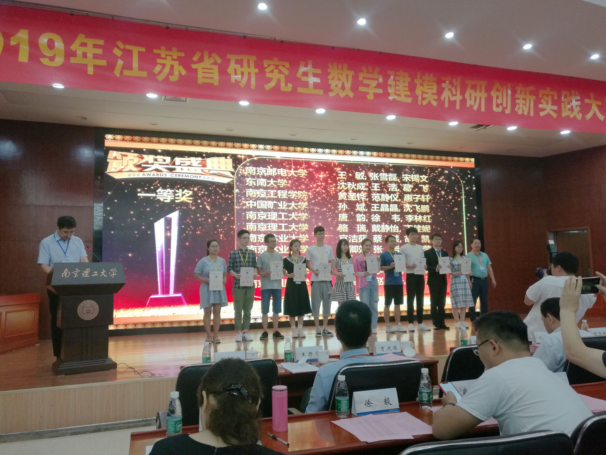 2019年7月14日上午,2019年(首届)江苏省研究生数学建模科研创新实践大赛颁奖大会在南京理工大学科技会堂举行,我校学子共获一等奖5项、二等奖(一等奖提名)3项、二等奖11项、三等奖19项的好成绩。同时1人获优秀指导教师称号,学校获优秀组织奖。研究生院研究生学位与培养办公室主任胡芳仁教授、理学院副院长唐加山教授以及获得一等奖及一等奖提名的学生代表参加了颁奖会,并上台领奖。 “江苏省研究生数学建模科研创新实践大赛” 是由江苏省教育厅专项资助的“江苏省研究生创新实践活动”主题赛事之一,是受江苏省教育厅和江苏省学位委员会委托,由江苏省理学1类研究生教育指导委员会主办的一项赛事。该赛事面向江苏省研究生培养单位的在读研究生(学科专业不限),旨在激发省内广大研究生利用数学科学方法探究、解决工程技术和社会经济发展中的实际问题,培养研究生创新意识和创造能力,培养研究生团队协作意识,提升研究生创新实践能力,进一步促进学科的交叉融合和研究生培养质量的提高。 2019年(首届)江苏省研究生数学建模科研创新实践大赛在中国研究生数学建模竞赛专家委员会指导下,由江苏省工业与应用数学学会协办,南京理工大学承办,竞赛组委会办公室设在南京理工大学理学院。4月上旬组委会发布竞赛通知,由来自全省31所高校和科研院所的2300余名研究生组成的790支队伍参加了竞赛。根据《江苏省研究生数学建模科研创新实践大赛章程(试行)》的评审规定和要求,大赛专家委员会组织专家对参赛论文进行了匿名网络通讯评审和专家委员会现场会评,评选出2019年江苏省研究生数学建模科研创新实践大赛初赛获奖名单并上网公示,再经过7月13日对于一等奖提名参赛队伍的匿名决赛答辩,共评出一等奖34个、二等奖118个(其中一等奖提名13个)、三等奖163个。 在学校及研究生院的指导与支持下,经过理学院及数学建模竞赛组委会的精心组织下,我校共有85支队伍报名参赛,在数模教练组的指导下,我校获一等奖数量仅次于南京理工大学,位居全省第二名。获奖名单附后。 附:获奖名单 序号 | 队号 | 队员姓名 | 获奖等级 | 1 | 201911370 | 杜心雨,孙玉欣,程希 | 一等奖 | 2 | 201911414 | 季伟,王宇辰,李玉颖 | 一等奖 | 3 | 201911482 | 万斯特,王一凡,蒋定伟 | 一等奖 | 4 | 201911751 | 王敏,张雪磊,宋锡文 | 一等奖 | 5 | 201914179 | 王曼,朱晗,黎春兰 | 一等奖 | 6 | 201910903 | 王海云,陈燕,汤锐 | 二等奖(一等奖提名) | 7 | 201911025 | 高基旭,张梦涛,宣涵 | 二等奖(一等奖提名) | 8 | 201911242 | 王纪涛,蒋帅,印桃 | 二等奖(一等奖提名) | 9 | 201910639 | 林秋丽,赵强,徐冉 | 二等奖 | 10 | 201910939 | 胡奕旸,张宇婷,石陈杰 | 二等奖 | 11 | 201910994 | 王旭天,方美东,陈定甫 | 二等奖 | 12 | 201911162 | 杨凌青,吴济洲,范译 | 二等奖 | 13 | 201911254 | 梅雪峰,李韦,魏海洋 | 二等奖 | 14 | 201911286 | 曹振声,章超,秦秋阳 | 二等奖 | 15 | 201911330 | 顾雯莹,夏晏雯,张利 | 二等奖 | 16 | 201911562 | 刘玉琪,俞杰,宋亚东 | 二等奖 | 17 | 201911763 | 赵晓飞,陈方君,张亚梅 | 二等奖 | 18 | 201911871 | 孙誉焯,马荣,董杰 | 二等奖 | 19 | 201912310 | 楼鑫雯,祁婷婷,顾高纯 | 二等奖 | 20 | 201910691 | 缪子阳, 杨欣谊,田玉秀 | 三等奖 | 21 | 201910875 | 潘万顺,李通,徐鑫 | 三等奖 | 22 | 201910907 | 顾志兰,李猛,王晓慧 | 三等奖 | 23 | 201911060 | 黄婉晴,凤丽丽,吴宇鹏 | 三等奖 | 24 | 201911072 | 申瑞娟,花航,孟乃宣 | 三等奖 | 25 | 201911106 | 周凡,张贵成,凌雪延 | 三等奖 | 26 | 201911342 | 汤平川,马捃凯,常月欣 | 三等奖 | 27 | 201911386 | 潘招来,陈志敏 | 三等奖 | 28 | 201911402 | 岳英杰,郝健康,郭凯 | 三等奖 | 29 | 201911406 | 陈瑞,姚玲 | 三等奖 | 30 | 201911434 | 孙京京,张书根,吴耀 | 三等奖 | 31 | 201911474 | 张云伟,秦杰,邓大山 | 三等奖 | 32 | 201911606 | 陈静怡,宫代丽,肖芮文 | 三等奖 | 33 | 201911771 | 刘云,王德昊,卢浩勇 | 三等奖 | 34 | 201911891 | 陈鹏程,王明月,陈奉然 | 三等奖 | 35 | 201912338 | 陈爱月,徐波,方海超 | 三等奖 | 36 | 201912953 | 王璐瑶,刘若晨,许晶晶 | 三等奖 | 37 | 201913845 | 茹欣,赵珈琪,胡钟秀 | 三等奖 | 38 | 201913941 | 黄庆龙,胡承曦 | 三等奖 |
